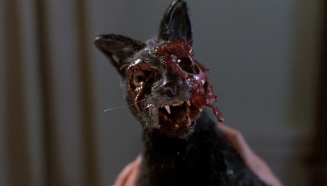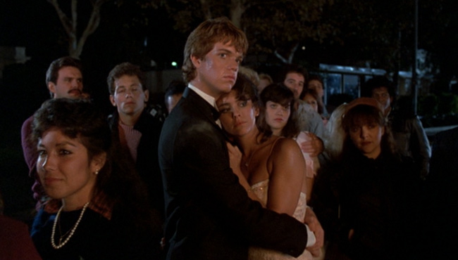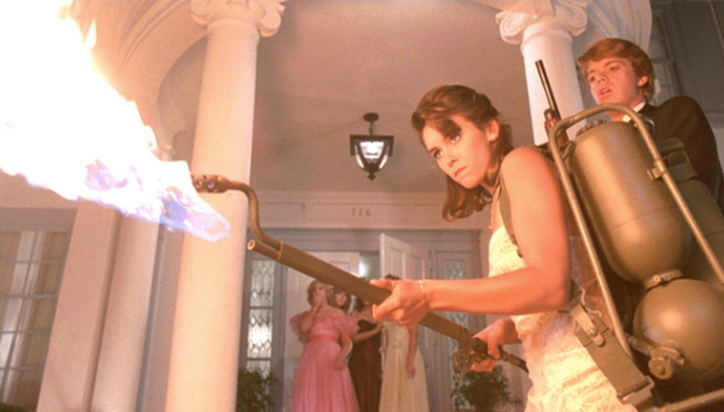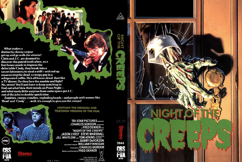 A bevy of unflattering taffeta and lace prom dresses, sculpted teenage boy hair, exploding heads, an axe murderer, aliens from outer space, a vengeful tough guy cop, frat pranks, cryogenics, flame throwers, grotesque slugs, zombie cats (and dogs), and even some brief nudity and a touching young man friendship… yep there’s a lot to love about The Night of the Creeps.