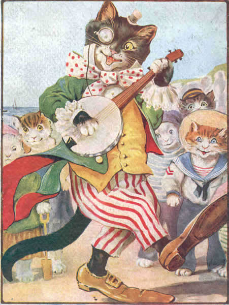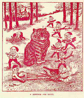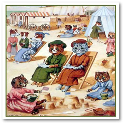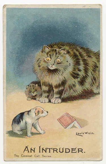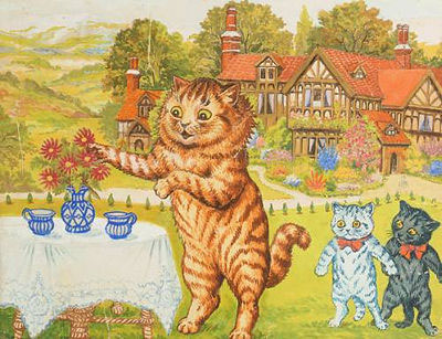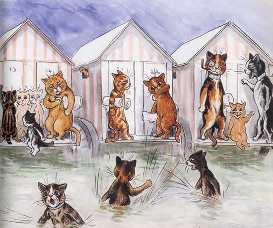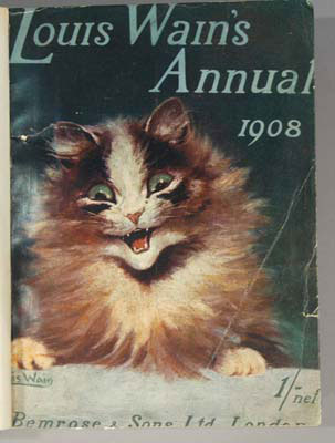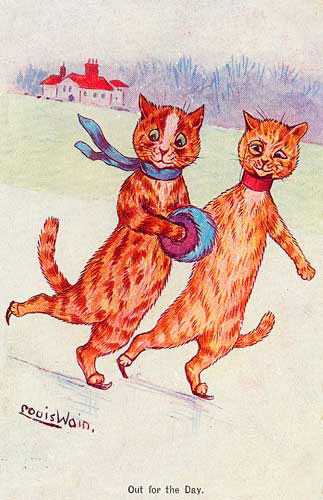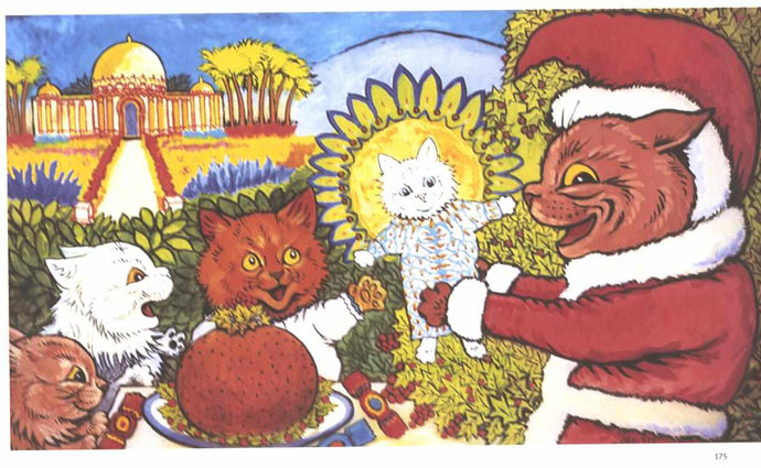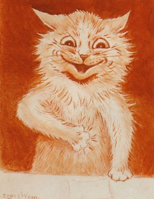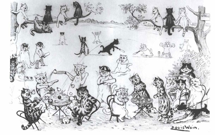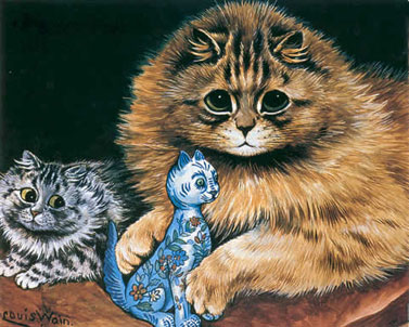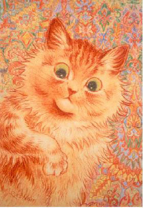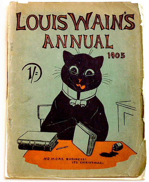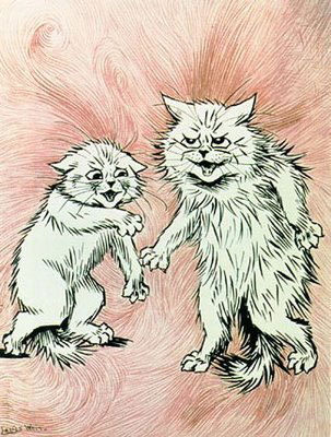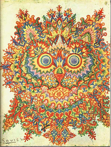 Who knew that the world’s biggest cat lady was in fact a man? Louis Wain began his career as a cat artist after a beloved pet got his wife through the pain of suffering from cancer. His anthropomorphous illustrations were quite popular in their day (being the 1880’s) and I’d die for one of his annuals. Sadly, he was struck by severe and escalating mental illness in his later years – a case that surely lends credence to the theory that toxoplasma can cause changes to human personalities – a theory expounded on in a fascinating Parasites episode of Radio Lab. Wain didn’t stop painting and drawing cats while he was institutionalized and his work took on a wild psychedelic and geometric turn. I am surprised his work has not been embraced by the outsider art loving community like Henry Darger’s.