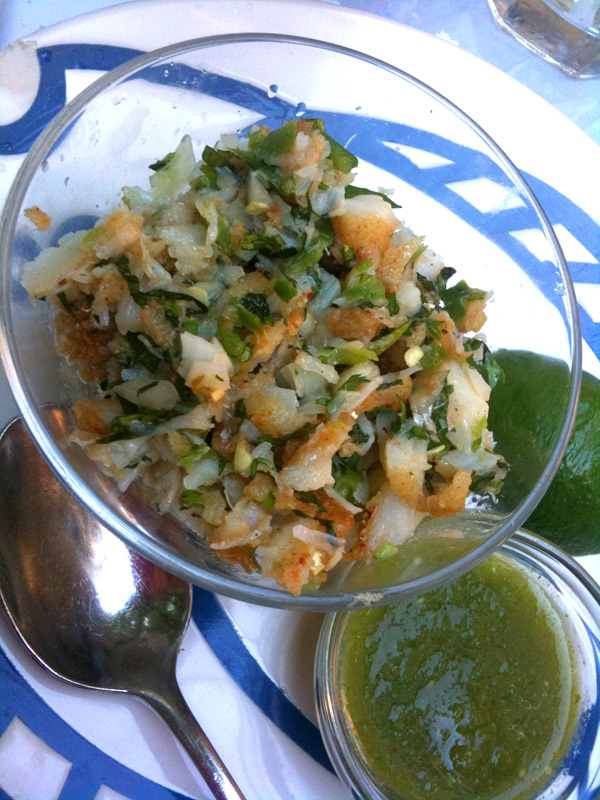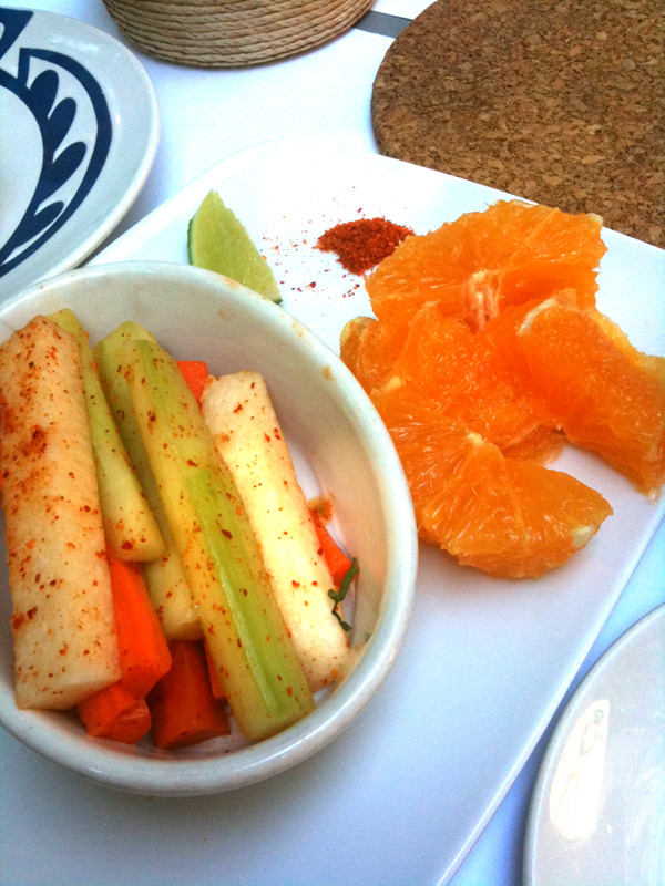 Fonda boasts a pleasant back yard and an even more pleasant menu to enjoy in these perfect summer days. From overstuffed sweet vanilla french toast to spicy chilequeles, the brunch menu offers a little something for every taste (so long as you like flavorful true Mexican cuisine) but having already partaken in some homemade breakfast tacos earlier in the day, I decided to pull a few items from the regular menu: a chunky jicama, carrot, orange, and cucumber salad with spiced sugar for dipping, a completely refreshing chilled chayote soup with apples and chives which I highly recommend if nothing else, and a white fish salad with corn tortillas that was flavorful and light. If Fonda were in my neighborhood I’d be no stranger to their deliciousness repeatedly, in fact, right now I am wanting another bowl of that soup.