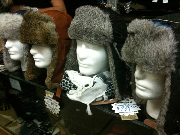 It’s one of the hood’s most friendly stores, and while we’re at it, possibly one of the nicest in the whole city. Family run since 1975, you will be helped with courtesy and find everything you need. Since it stocks utilitarian goods, we always find something useful – Jim usually gets a new set of winter gear every season. This season? They have great looking heathered sweater trooper hats, nice wool scarves and simple military gloves. (He models all three below).
