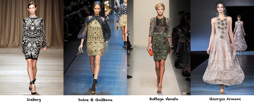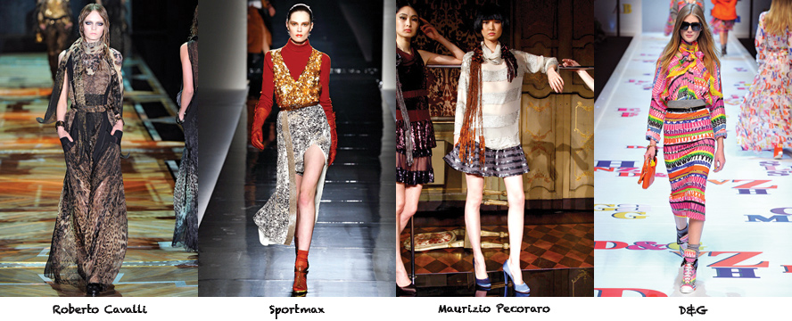 What topsy turvydom! Roberto Cavalli had some of my favorite looks with it’s over the top gypsy mess. He may represent the ultimate in Euro trash, but I have to say I love the feathery, Stevie Nicks, shiny business that was going on at the throats. And this layered animals print gown is pretty killer.