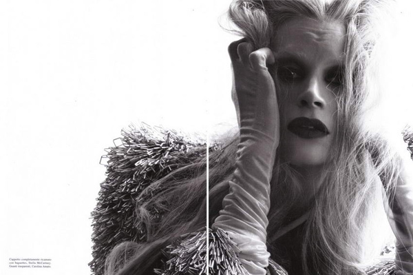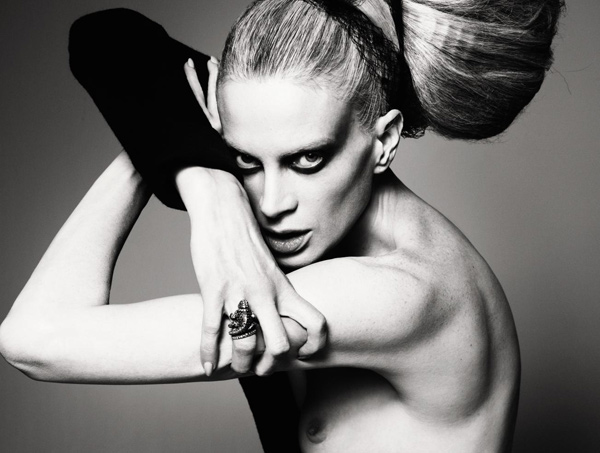 I remember being mesmerized by her haunting eyes and pale skin in edgy editorials when her hair was ultra short and jet black. Now she sports the most ferociously awesome hair – waist length and silvery grey and with it has probably become my favorite current model working.