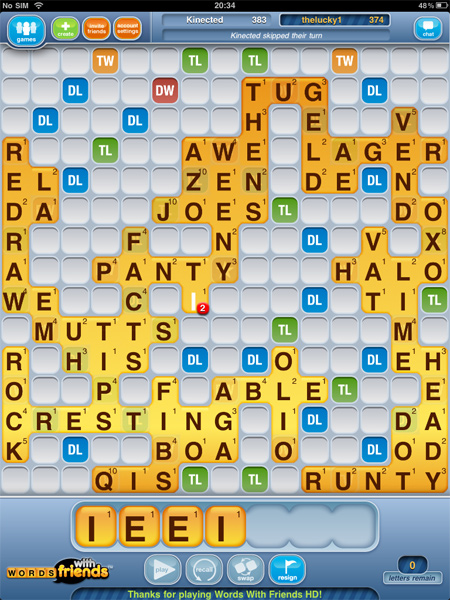 I’ve jumped on the Words with Friends bandwagon and it’s as addicting as I had expected (very). I seem to win about 50% of the time.
