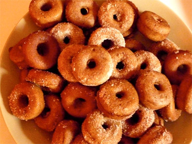 while the donuts are still warm roll each one in the liquid mixture followed by the sugar mixture. let cool and enjoy.