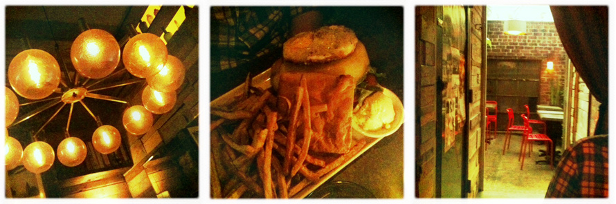 Jim and I split some artful main courses of smoked sturgeon with leeks, pumpernickel and buttermilk and steak with brussel sprouts and mushrooms.