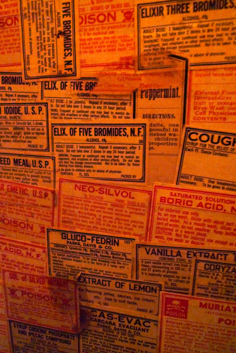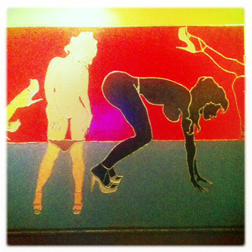 It looks like an unfinished set inspired by cinema of the late 80’s and early 90’s (Beetlejuice and Cool World perhaps). There’s a mixture of the building’s history as a go-go club (hence the sign and stripper murals), art nouveau, and folksy crafts, all conjured up by the mind and artisan-ship of one particular and peculiar vision.