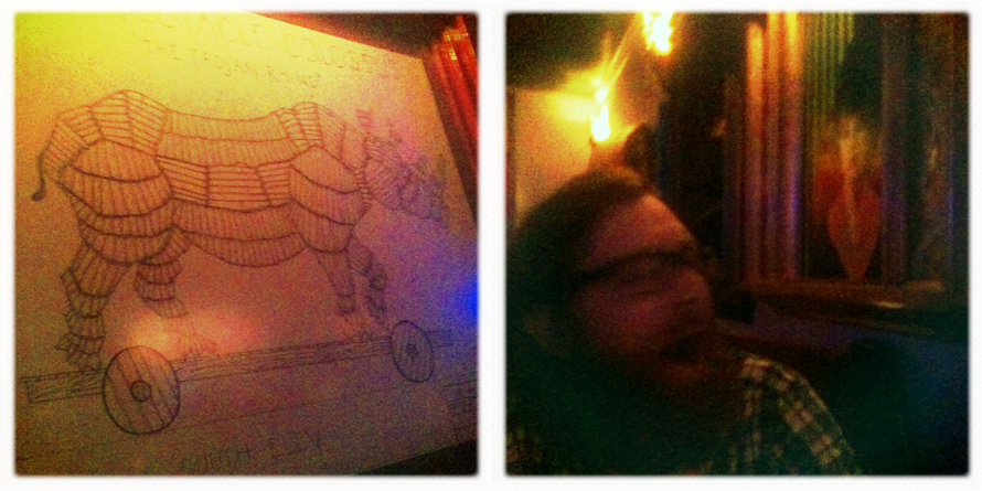 From a spider web sculpture above the bar to a creepy portrait of a woman that reminds me of the portrait of a dead wife one might find in a haunted house movie from the 70’s (see yawning Jim photo below), the decor is confused and bizarre.