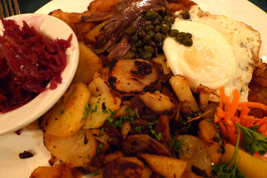 The menu is full of traditional dishes including Schnitzel a la Holstein – which my favorite way to take a schnitzel: with a fried egg, anchovies, and capers. It was the most impressive looking dish of the night (as you can see from the photo) and it was delicious despite the egg being far too set for my taste.